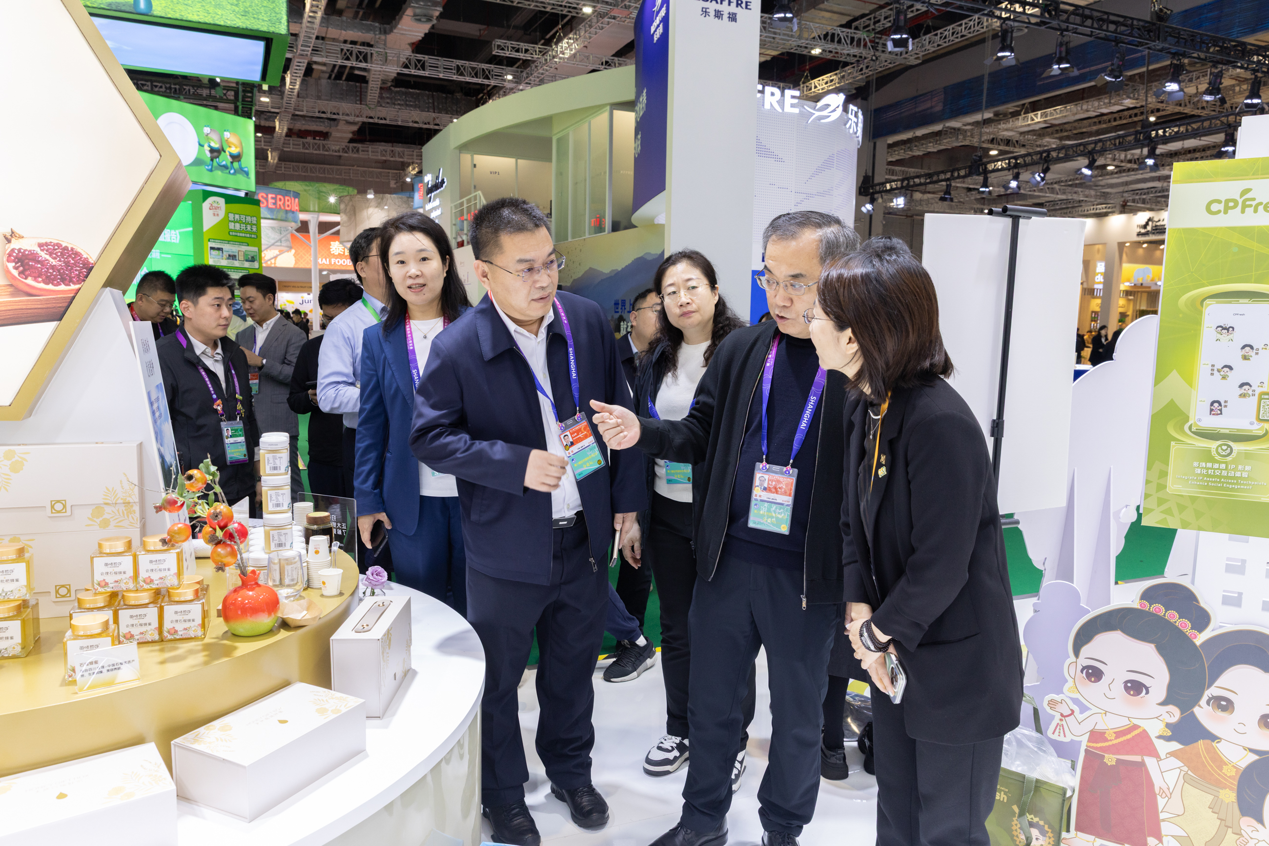 ▲上海市楊浦區(qū)委書(shū)記薛侃(中)、副區(qū)長(zhǎng)尼冰(左)一行參觀正大展館,郝鵬飛集團(tuán)資深副總裁(右)熱情接待來(lái)賓并介紹正大蜂蜜產(chǎn)品。