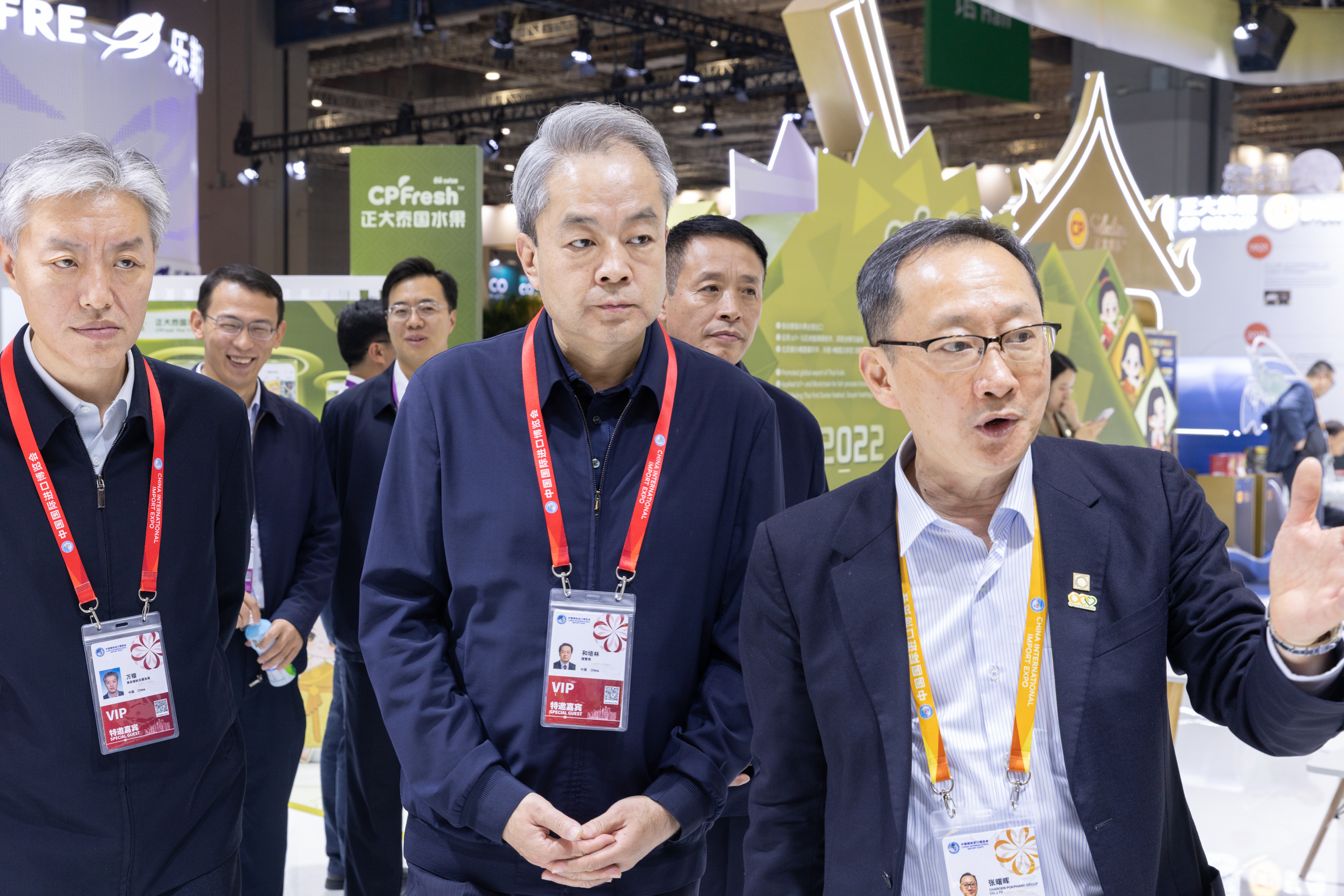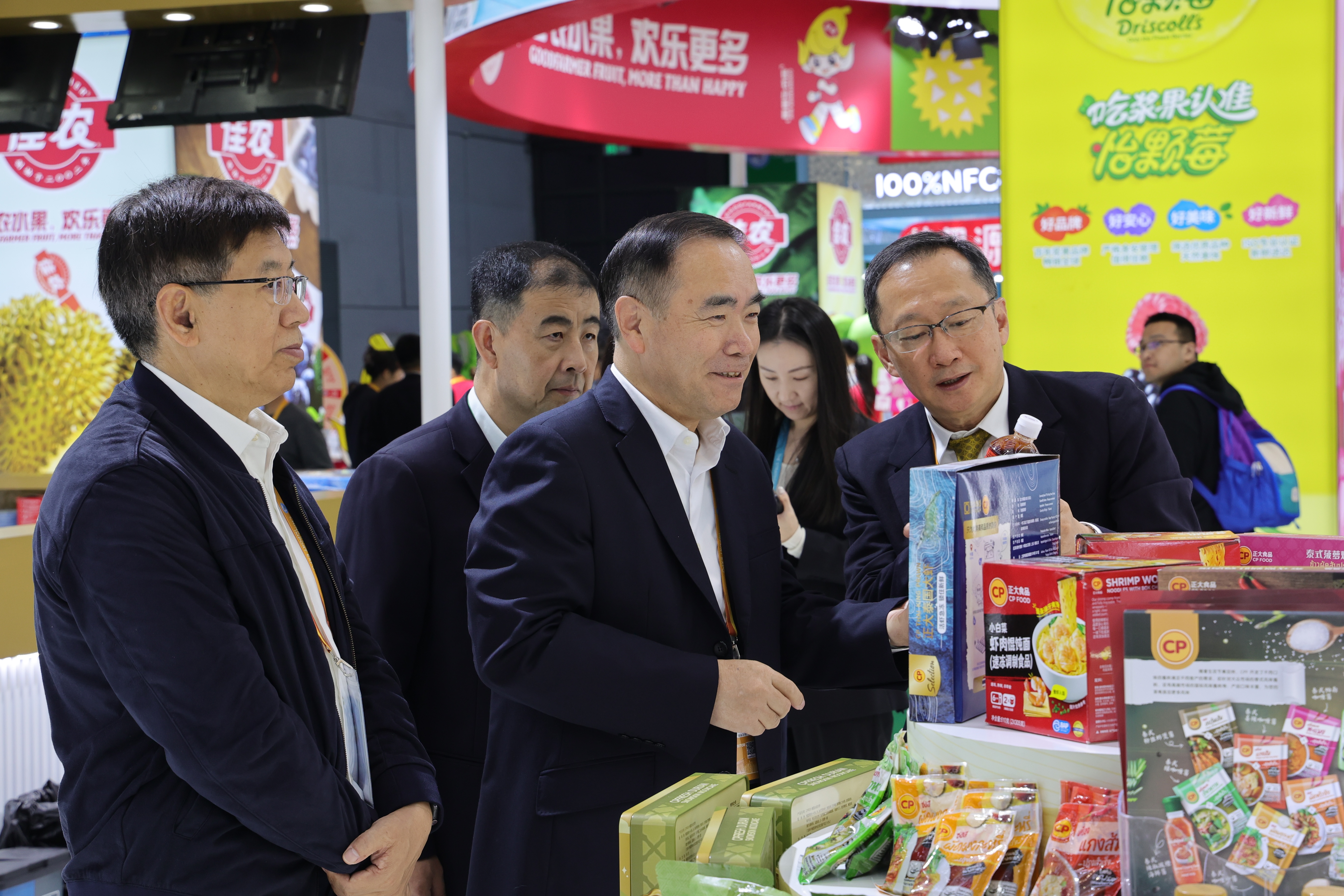 ▲正大集團(tuán)農(nóng)牧食品企業(yè)中國(guó)區(qū)資深副董事長(zhǎng)兼首席建設(shè)官邵來(lái)民(前排中)參觀正大展館,正大集團(tuán)董事長(zhǎng)助理王琦(前排左)、集團(tuán)農(nóng)牧食品企業(yè)中國(guó)區(qū)市場(chǎng)中心資深總裁張曙暉(前排右)陪同參觀。
