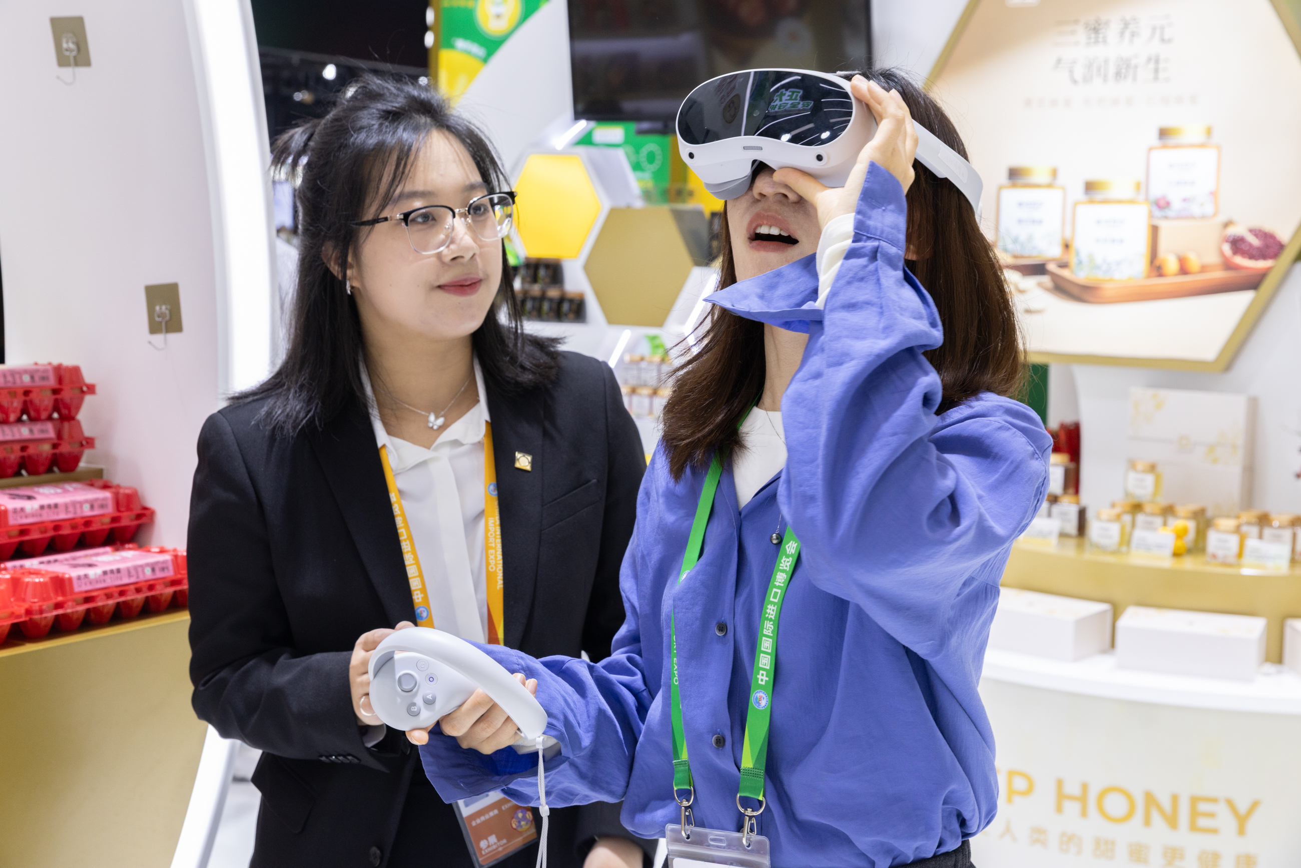 ▲工作人員在正大展館指引觀眾進(jìn)行VR互動(dòng)體驗(yàn)。