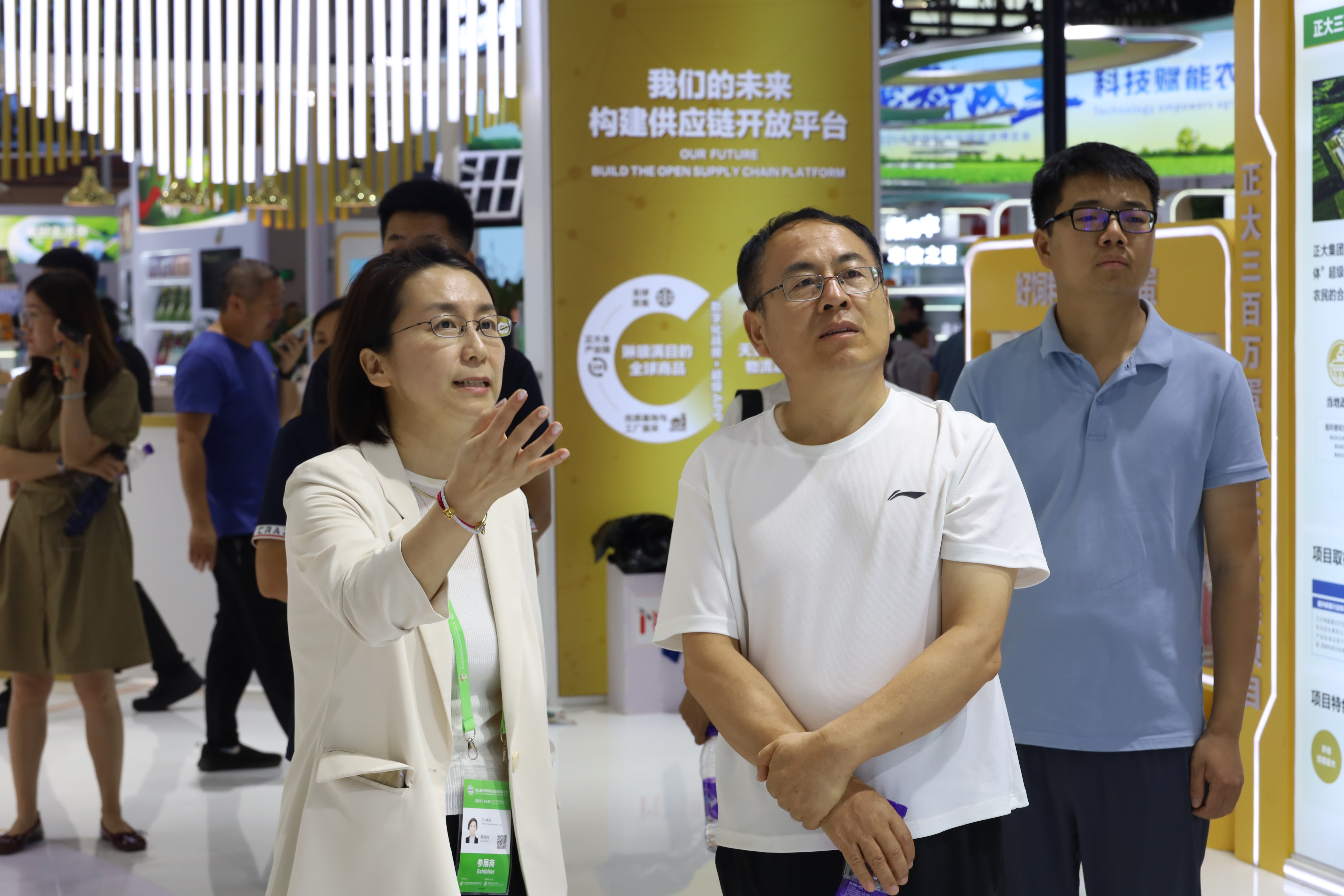 商務部歐亞司一行參觀正大展館,正大集團農牧食品企業中國區市場中心品牌傳播總監郭悅楊(右)熱情接待來賓。