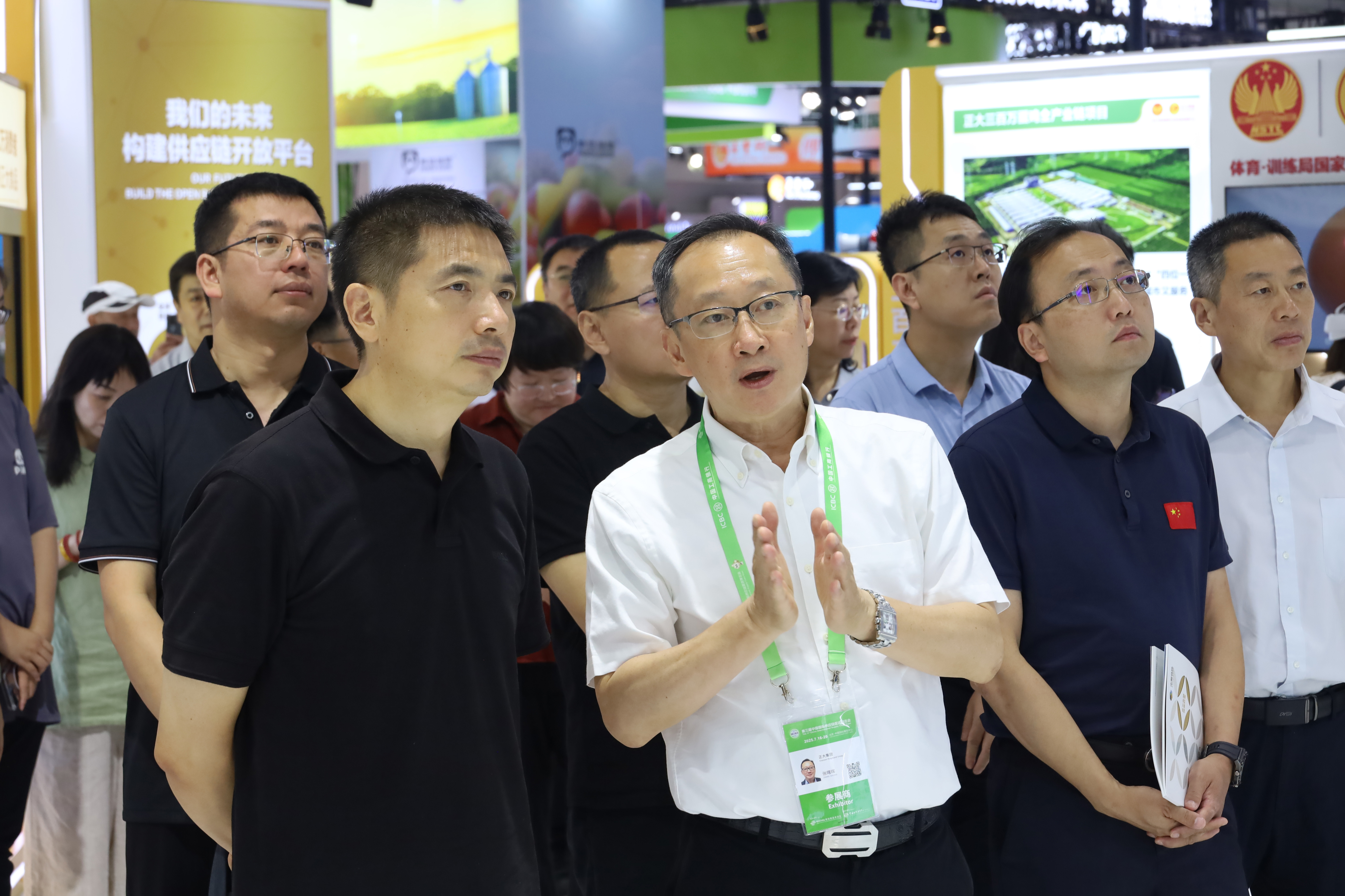 中國貿促會會長任鴻斌(中)、副會長陳建安(右一)一行參觀正大展館,正大集團農牧食品企業中國區市場中心市場活動總監楊帆(左一)熱情接待來賓。任鴻斌會長高度評價正大展館,他表示,正大集團本屆參展效果突出,生態樹設計深度契合鏈博會主題。考察正大內蒙古百萬頭生豬養殖項目展區時,他還特別稱贊:“正大全產業鏈食材品質卓越。”