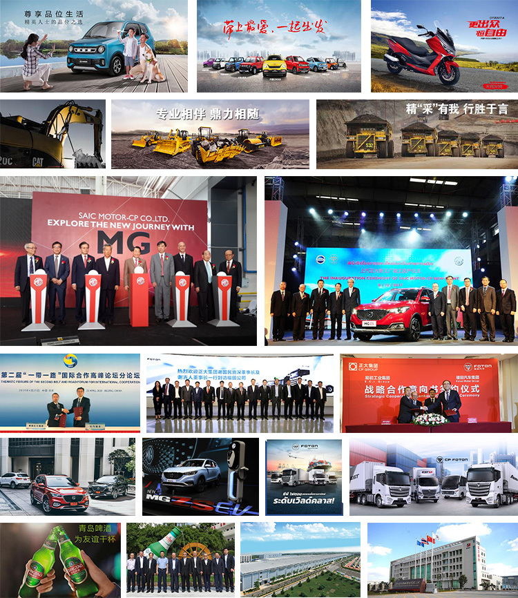 在泰國: 與中國汽車企業上汽集團合資建立上汽正大有限公司,MG(名爵)品牌生產基地。設計產能為10萬輛,2018年MG品牌開始在泰國市場布局新能源產品。合資工廠未來將成為MG品牌全球右駕車市場的制造基地。